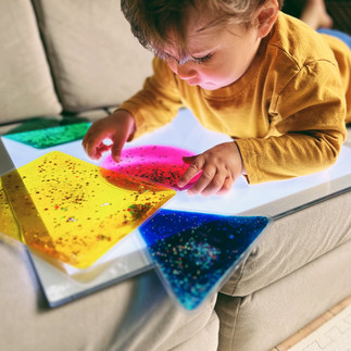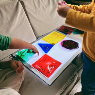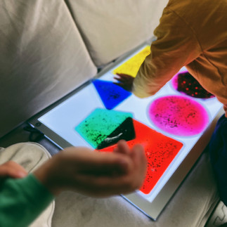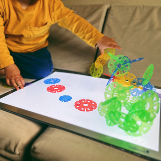 Light tables provide for an excellent resource for sensory input. Children are often calmed by the glow of the table and the visual stimulation enhances their experience as they explore. Light and colors are all around us and from birth and children pay a great deal of attention to them due to its ever evolving magical nature. The presence of light and color instantly makes a child curious and deeply engaged whether they are chasing a shadow, using a flash light, exploring materials, building, and so on, due to the fact that they are always drawn to light.