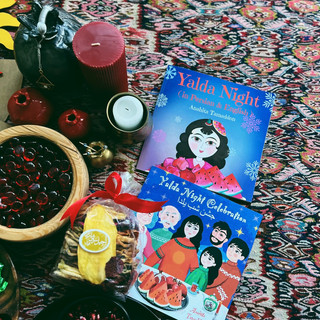 To deepen the understanding or connection to this holiday you can read the bilingual book Yalda Night and Yalda Night Celebration both by Anahita Tamaddon where they tell the story of families who celebrates Yalda. Here are the traditions of celebration: A sofreh table setting where everything is usually decorated in crimson hues of red to represent dawn and glow of life, along with candles to bring ligh, life, & joy into the long night. Sweets, pastries, fruits (pomegranate, watermelon, persimmon, oranges) and nuts are eaten all throughout the night. Every family member does a “Divan-e Hafez” where you get a "Fal." This is where you make a wish, ask a question, and when you open the book, the page that appears will be the answer to your question.