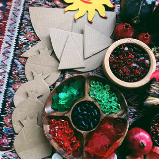 After reading the story, you can discuss the symbolic meanings of the Yalda Sofreh along with the traditions by letting the children explore the objects. And then provide watermelon and pomegranate shapes out of recycled cardboard and loose parts (black rocks, translucent shapes, acrylic rocks, and flat marbles) for the child to create the fruit.